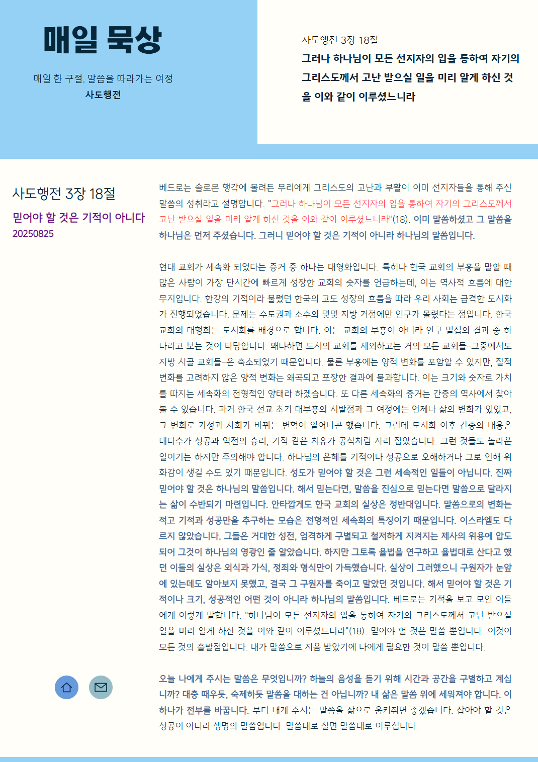 베드로는 솔로몬 행각에 몰려든 무리에게 그리스도의 고난과 부활이 이미 선지자들을 통해 주신 말씀의 성취라고 설명합니다. "그러나 하나님이 모든 선지자의 입을 통하여 자기의 그리스도께서 고난 받으실 일을 미리 알게 하신 것을 이와 같이 이루셨느니라"(18). 이미 말씀하셨고 그 말씀을 하나님은 먼저 주셨습니다. 그러니 믿어야 할 것은 기적이 아니라 하나님의 말씀입니다.