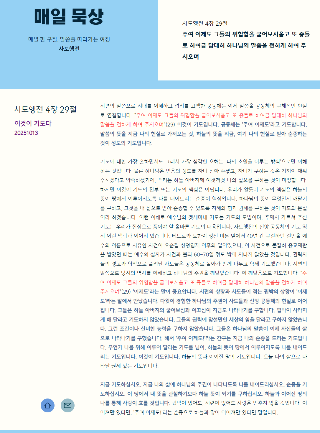 시편의 말씀으로 시대를 이해하고 섭리를 고백한 공동체는 이제 말씀을 공동체의 구체적인 현실로 연결합니다. "주여 이제도 그들의 위협함을 굽어보시옵고 또 종들로 하여금 담대히 하나님의 말씀을 전하게 하여 주시오며"(29) 이것이 기도입니다. 공동체는 '주여 이제도'라고 기도합니다. 말씀의 뜻을 지금 나의 현실로 가져오는 것, 하늘의 뜻을 지금, 여기 나의 현실로 받아 순종하는 것이 성도의 기도입니다.
